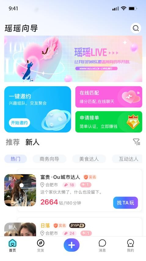 瑶瑶App是一款专为年轻人打造的多元化社交平台,致力于为用户提供真实有趣的社交体验。在这里,你可以轻松发现附近志同道合的网友,通过即时聊天功能拉近彼此距离,无论是寻找浪漫缘分还是结交旅行伙伴都能一键实现。平台创新融合线上互动与线下约玩模式,支持用户关注心仪对象并实时追踪其生活动态。从同城向导预约到兴趣组队功能,从情感交流到旅行陪伴,瑶瑶App用智能匹配技术为你搭建安全可靠的社交桥梁,让每一次相遇都充满可能。现在就下载瑶瑶App,开启你的精彩社交之旅吧!