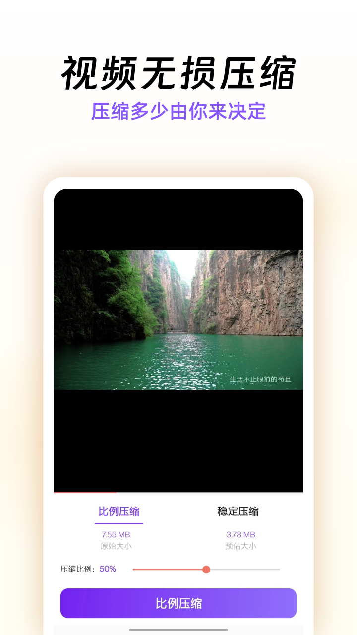 2.随时随地进行视频、图片等压缩,无损压缩保存源文件品质,还更省空间。采用先进的压缩算法,在将视频体积压缩50%的同时,几乎看不出画质损失。