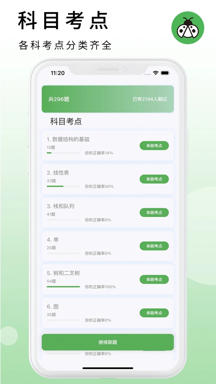 2、科目考点:每个考点完全分类,可以随时随地在线学习。考点配有思维导图,帮助建立知识框架。学习进度可视化展示,清晰了解掌握程度。