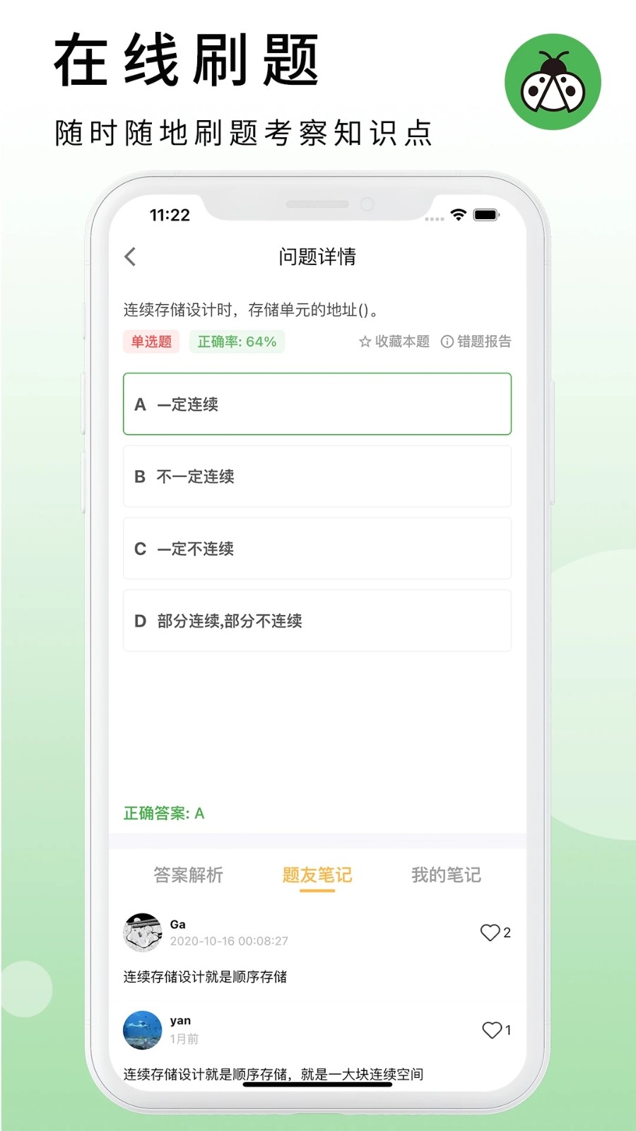 2、在线答题:随时随地打开APP进行答题,测试知识点。答题过程流畅,支持离线做题。答题界面简洁清晰,专注答题体验。
