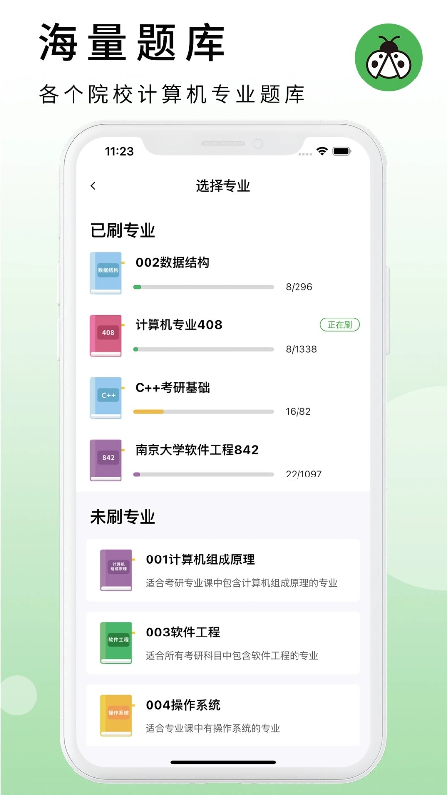 码虫刷题是一款专为考试学习打造的智能刷题软件,致力于帮助用户高效提升考试成绩。软件拥有海量题库资源,覆盖计算机、考研等多个热门考试科目,无论您是想查漏补缺还是系统复习,都能找到合适的练习内容。其特色笔记功能让学习更高效,用户可以随时记录重点知识,制定个性化学习计划。通过智能错题分析和真题模拟,让您精准掌握薄弱环节,实现成绩的稳步提升。