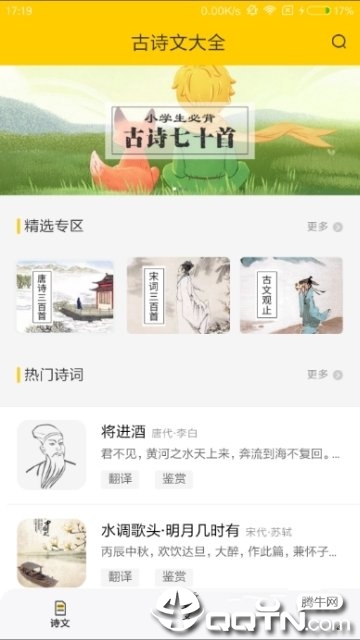 古文翻译是一款专为诗词爱好者打造的学习应用,汇集了中华五千年文化精髓。这里收录了8000多句经典古诗文,涵盖唐诗、宋词、元曲及各朝代名篇,每首都配有精准翻译和深度鉴赏。无论您是想提升文学素养,还是为学业打基础,都能在这里找到丰富资源。应用界面简洁,分类清晰,让您随时随地感受中华文化的博大精深。快来开启您的古文学习之旅吧!