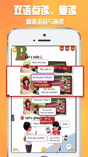 2、双语发音准确清晰,帮助孩子准确掌握发音。采用AI语音评测技术,对发音准确度进行实时评分,详细标注元音、辅音等发音要点偏差。