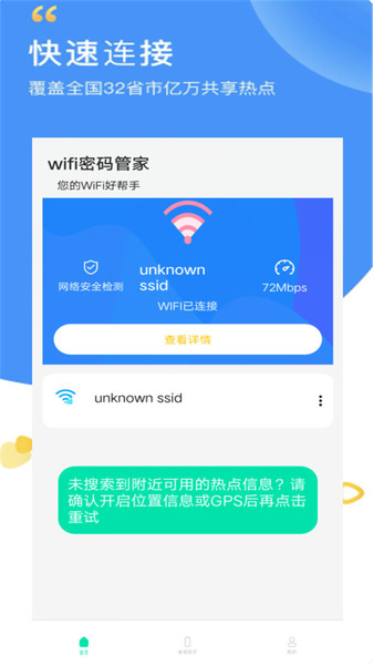 这是一款功能非常实用并且丰富的APP,无论是你想要连接周围的无线WiFi,还是测试已连接WiFi的安全性和速度,都能帮你快速解决!它还能为你的手机瘦身,清理手机内存垃圾,包括无用安装包、广告垃圾、缓存垃圾、卸载残留等,让你的手机运转如飞!