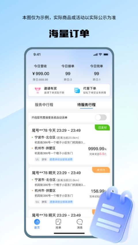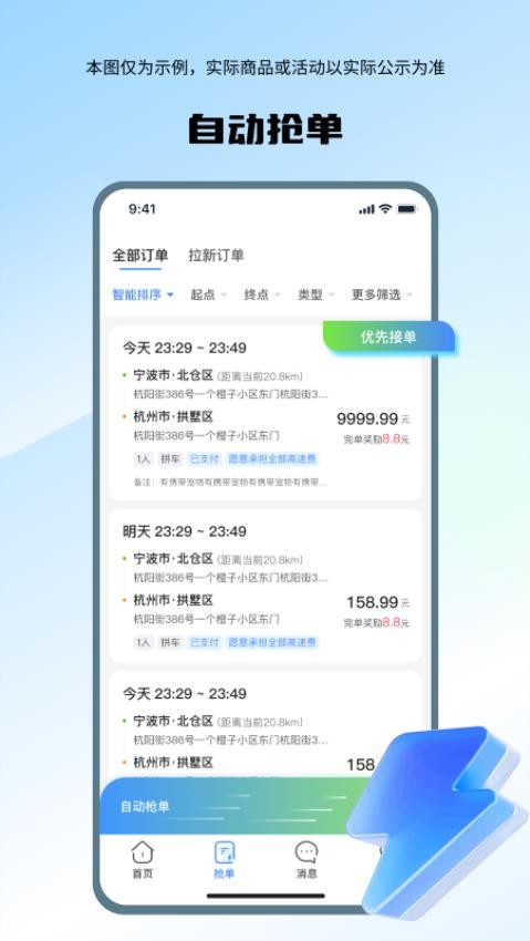 智能抢单系统可24小时不间断工作,根据预设条件自动抢单。司机可设置抢单偏好,如订单金额范围、行驶距离等参数,系统将优先抢符合要求的优质订单。抢单成功率高达95%,让司机不再为抢不到单而烦恼。