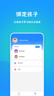 5.绑定孩子:家长可以绑定多个孩子的学习账号,实时查看孩子的学习进度和成绩变化,及时给予指导。