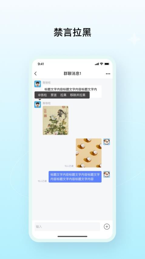 3、进行群聊房间,可自定义发送信息,还能对群聊设置禁言;在群聊界面可使用丰富的表情包和快捷回复功能,提升沟通效率。管理员可设置群规,管理成员发言权限,维护群秩序。