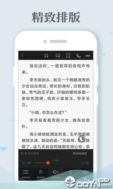 【高清设置】提供多种专业阅读模式,包括护眼模式、仿真翻页效果等,支持自定义字体大小、背景颜色、行间距等参数,打造最适合您的个性化阅读环境。
