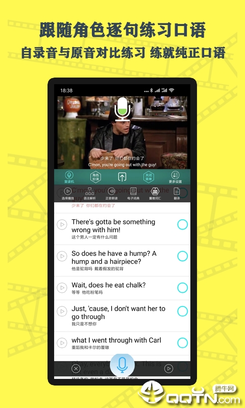 2、创新的口语练习模式,用户可以跟随角色逐句进行发音练习,通过自录音与影视原音对比功能,直观发现发音差异,逐步练就纯正地道的英语口语。