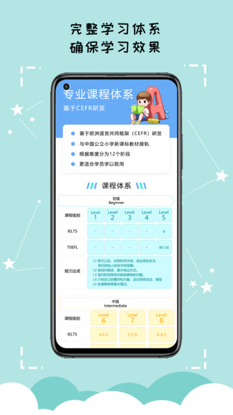 3、平台采用智能分级系统,学员可以根据自身英语水平和学习目标选择适合的课程。每个年级阶段都设有基础、进阶、强化三个难度层级,满足不同基础学员的个性化学习需求。