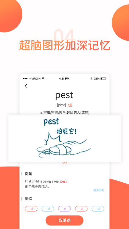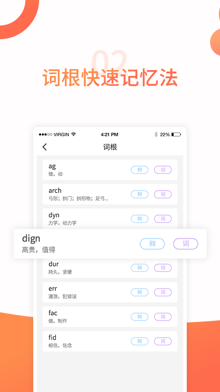 2、词根快速记忆法融合了80个高频词族和200+核心词缀,配合动态拆解动画;