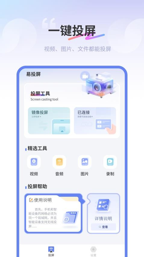 易投屏好快app最新版本是一款功能强大的专业投屏工具,支持视频、音频、图片等多种媒体文件的投屏播放。只需简单连接投屏设备,即可将手机中的各类媒体内容快速投射到大屏幕上,享受沉浸式的观影体验。软件特别提供了镜像投屏功能,并配有详细的操作说明,让用户能够轻松实现屏幕内容的实时共享。无论是观看本地视频还是播放音乐,都能获得更佳的视觉和听觉效果。此外,内置的录制工具还能帮助用户捕捉精彩画面并直接投屏播放。操作简单快捷,是提升娱乐和工作效率的理想选择。