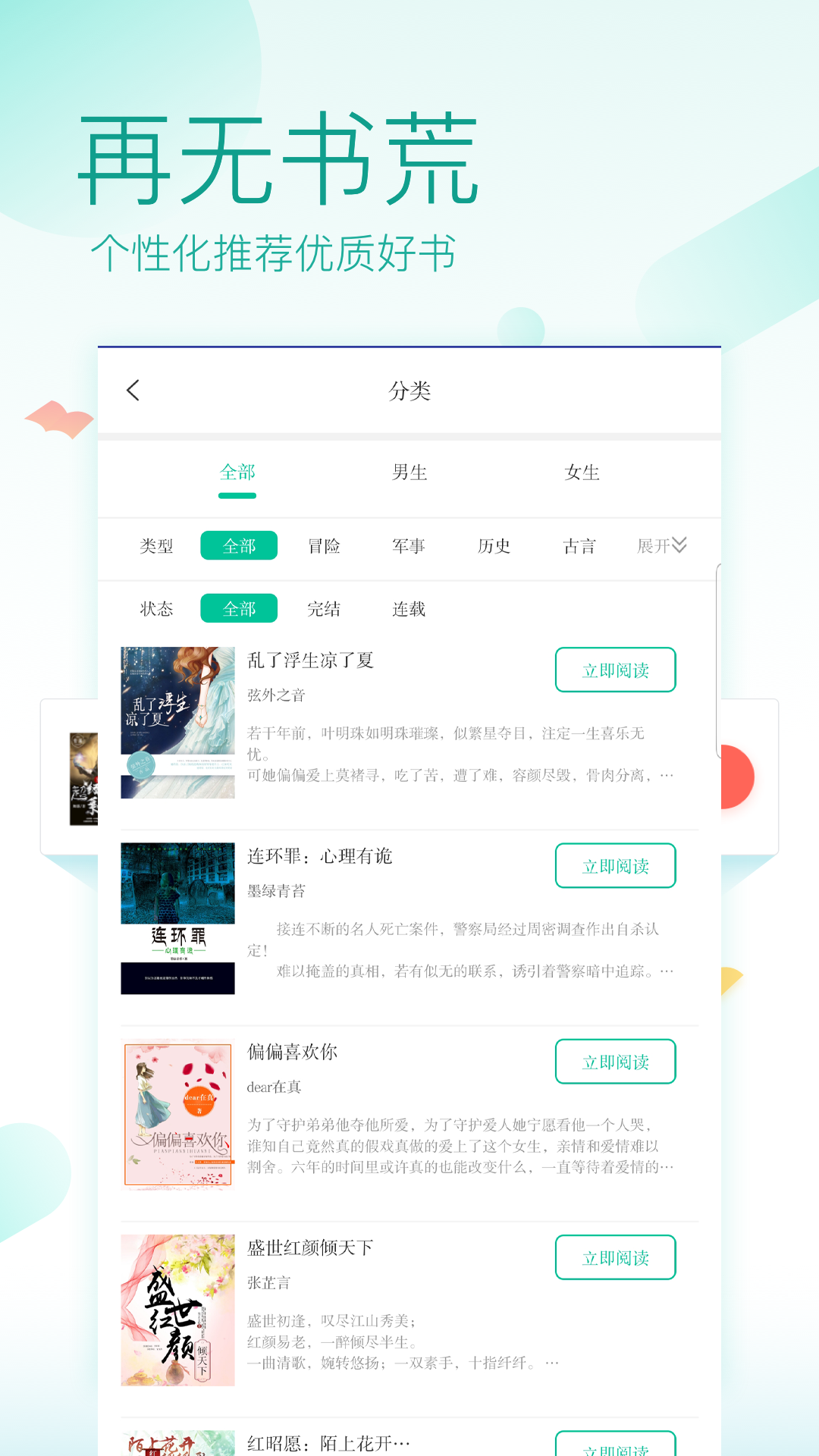 【海量小说资源】提供超大规模电子书库,内置数万册精品图书,实时更新各大榜单热门作品。分类体系科学完善,包含男频、女频、畅销榜等二十余种筛选维度,智能推荐算法根据用户偏好精准推送追更书籍,打造个性化阅读空间。