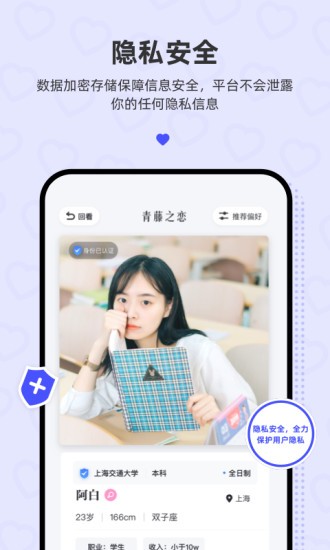 青藤之恋采用业内领先的认证体系,要求每位用户都必须完成实名认证和学历认证双重验证。平台的专业审核团队会对用户提交的所有资料进行人工审核,确保信息的真实性和完整性。这种严格的审核机制不仅提高了交友的安全性,也让用户能够更全面地了解潜在对象的背景。你可以在这里放心地浏览他人的资料,不必担心遇到虚假信息或诈骗行为。平台还会定期更新认证状态,确保用户信息的时效性,为你打造一个纯净、可靠的交友环境。