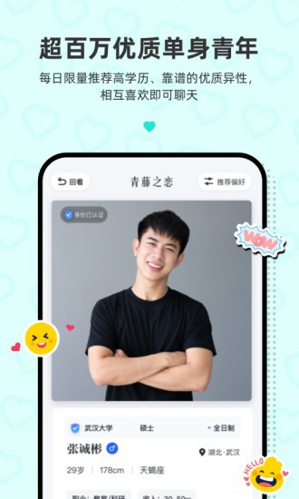 青藤之恋是一款专为都市高学历单身青年打造的高品质社交软件。在这个快节奏的时代,许多优秀的年轻人忙于学业和事业,社交圈却越来越小,难以遇到合适的另一半。青藤之恋通过严格的实名认证和学历审核机制,为用户打造了一个真实、可靠的婚恋交友平台。无论你是刚毕业的大学生,还是在大城市打拼的职场精英,都能在这里找到志同道合的伴侣。平台采用智能匹配算法,每天为你推荐最合适的对象,更有丰富的线上线下活动助你扩大社交圈。告别孤独,从青藤之恋开始你的浪漫之旅吧!