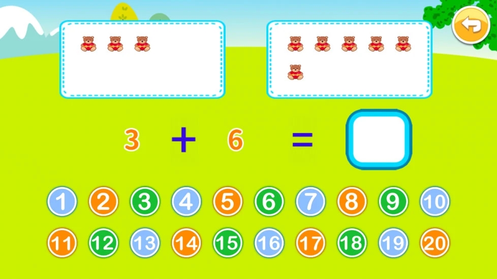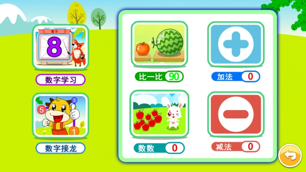 3)加法:通过数两个树上的苹果等形象直观的动画,让孩子轻松理解简单的加法运算;