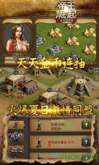 《帝王崛起-送328充值》是一款以古罗马帝国为背景的大型即时战略手游。游戏完美还原了古罗马时期的建筑风格和战争场面,玩家可以选择建造和升级自己的城市,通过合理分配资源来发展经济、研发科技、训练军队。游戏提供丰富的兵种系统,包括步兵、弓箭手、骑士、战象、投石车等,每种兵种都拥有独特的攻击技能和队长技能,让战场局势瞬息万变。玩家可以组建强大的帝国军团,与其他玩家展开激烈对抗,体验万人国战的震撼场面。此外,游戏还设置了众多独立关卡挑战,让玩家在PVE玩法中也能获得丰富的游戏体验。