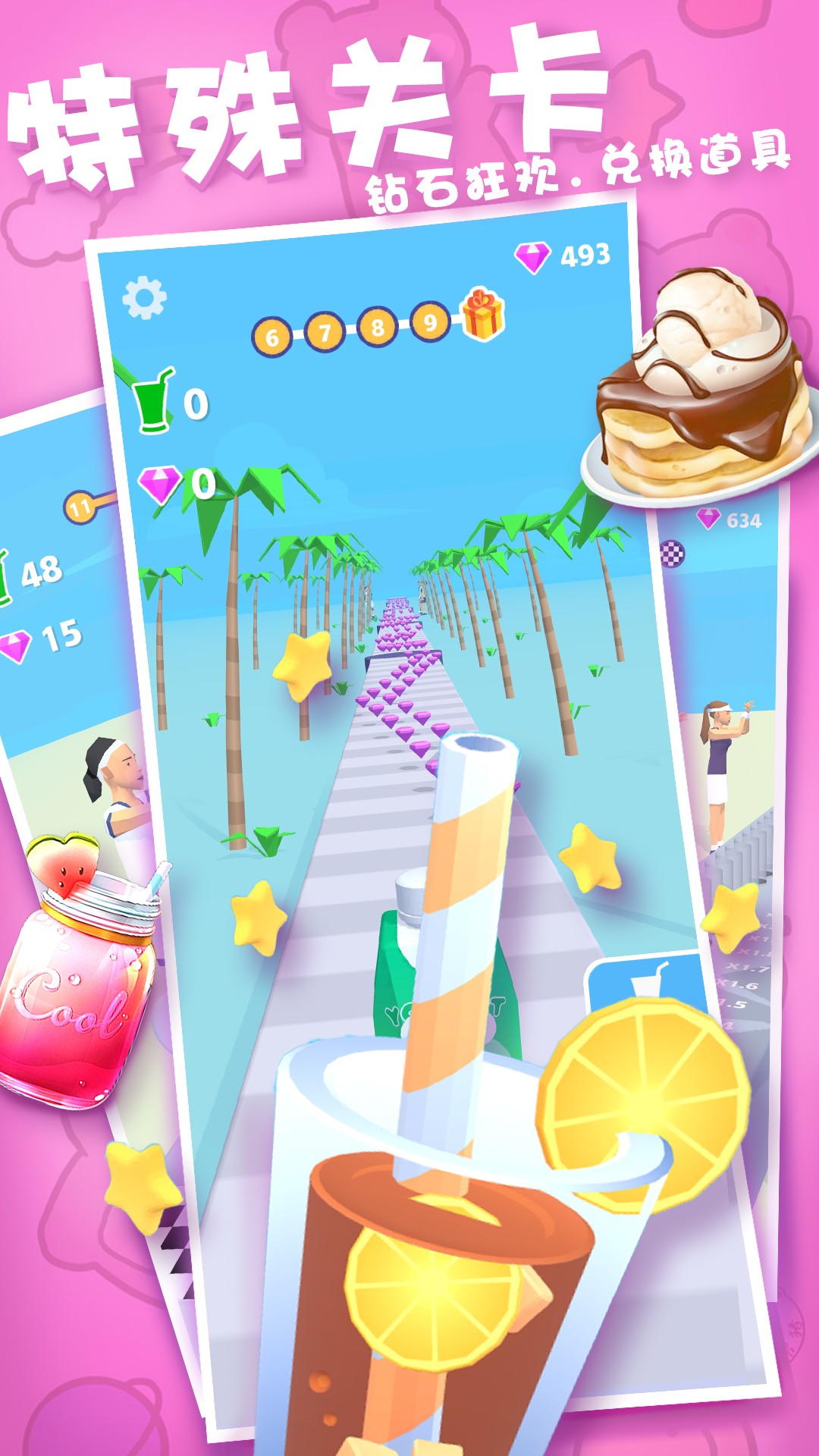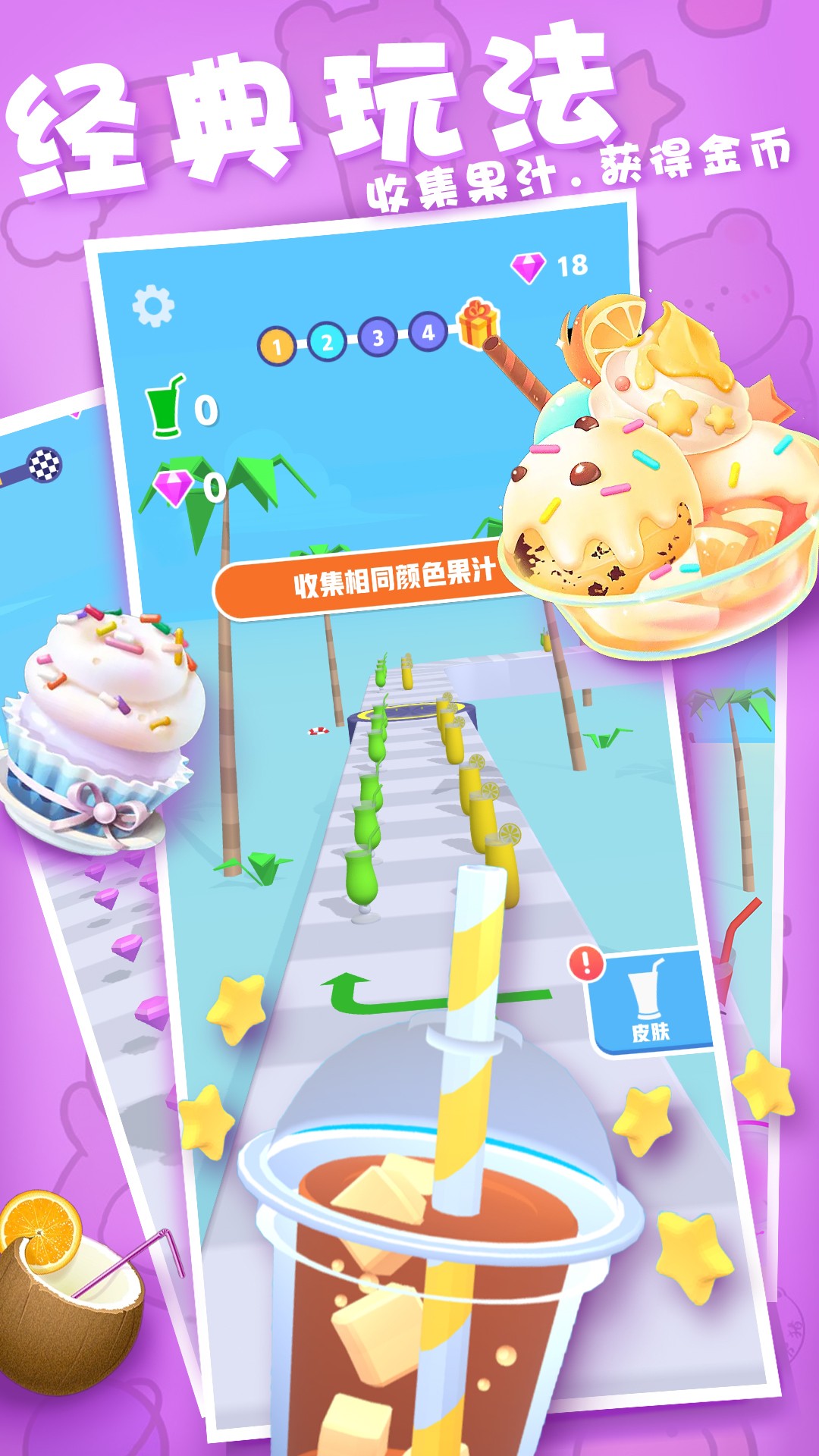 《果汁向前冲》是一款融合跑酷与果汁制作的创意休闲游戏。玩家将手持空杯开启趣味闯关之旅,沿途需根据任务要求收集各类水果原料,最终在终点前调配出指定饮品。游戏采用清新明快的卡通风格,操作简单却充满策略性——既要敏捷躲避障碍,又要精准拾取材料。跑道上随机刷新的加速道具和特殊果汁能为挑战增添变数,而不断解锁的新杯型和装饰系统让每杯果汁都独具个性。无论是想体验紧张刺激的跑酷,还是享受DIY饮品的乐趣,这款游戏都能带来双重满足。
