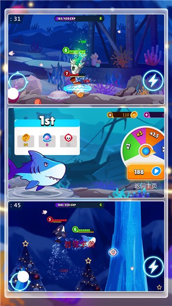 3、游戏提供了丰富的进化路线选择,玩家可以根据喜好培养不同特性的海洋霸主。从敏捷的鲨鱼到强壮的鲸鱼,每种进化方向都带来独特的游戏体验。任务系统贯穿整个成长过程,完成特定挑战还能解锁稀有外观和特殊能力,让游戏内容始终保持新鲜感。