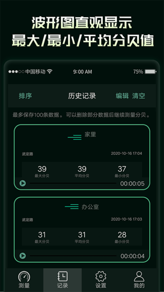 1、保存测试噪音记录,高清录音无损回放:自动保存所有测试记录,支持无损音质回放,方便用户随时调取历史数据进行对比分析。
