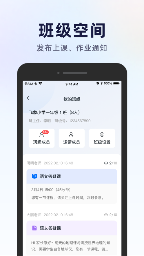 【班级空间】老师可以快速创建专属班级空间,支持批量导入学生信息或通过邀请码邀请成员加入。在班级空间内,教师可发布作业、通知公告、学习资料等内容,并设置查看权限。系统会自动记录班级动态,形成完整的教学档案。同时支持多教师协同管理,各科任课老师可以在同一空间内开展教学活动,实现跨学科教学资源共享。