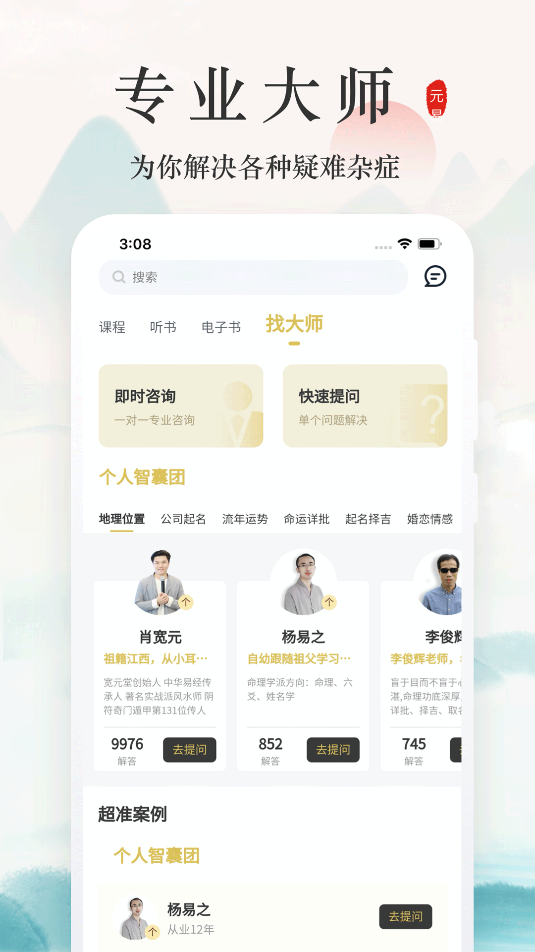 四、【找大师】汇聚众多资深命理专家,提供一对一专业咨询服务。无论是八字分析、占卜预测,还是人生困惑解答,都能得到专业可靠的指导。