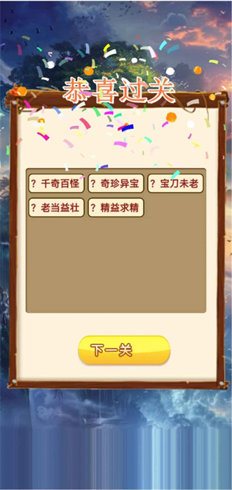 每个关卡都设有明确的目标要求,玩家需要在限定步数或时间内完成挑战。成功闯关后,系统会根据表现给予星级评价,并解锁新的关卡内容。游戏还设置了成就系统,记录玩家的各项里程碑。定期更新的关卡内容确保游戏始终保持新鲜感,让玩家持续享受成语接龙的乐趣。