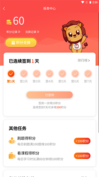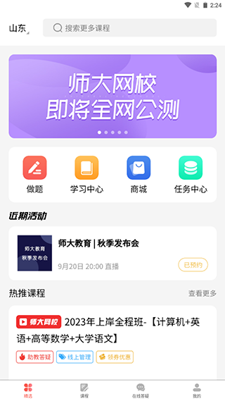 1、下载安装后,需要注册账号才可使用,注册好之后进入首页,可以看到做题、学习中心、任务中心等选项。首页采用智能推荐算法,会根据用户的学习进度和偏好,个性化推荐适合的学习内容和课程。