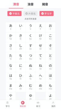 在这里学练测一条龙搞定日语50音图假名学习。软件采用科学的记忆曲线算法,通过反复练习和测试,帮助用户牢固掌握五十音图。同时提供发音示范和口型指导,确保发音准确到位。