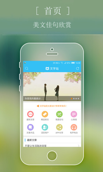 文字站是一个专为文学爱好者打造的优质交流平台,这里汇聚了来自全国各地的写作达人和阅读爱好者。平台致力于为用户提供纯净的文学创作与分享空间,无论是经典美文、优美句子还是散文随笔,都能在这里找到共鸣。我们为每位用户提供自由发表文章、分享心情、记录日记的功能,让文字成为连接心灵的桥梁。简洁清爽的界面设计搭配强大的功能配置,将为您带来极致的文学体验。立即加入文字站,开启您的文学之旅吧!