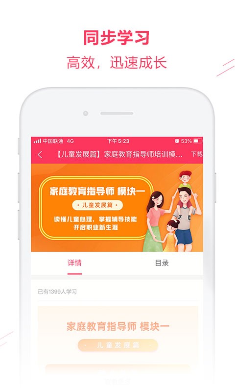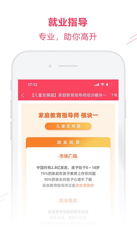 3、通过平台可以掌握0-18岁儿童成长规律,系统的学习教育学和心理学知识,让您拥有正确家庭教育指导能力,掌握科学培养孩子良好习惯的方法,突破时间和空间的限制,合理利用碎片时间,学习专业家庭教育,快速成为家庭教育指导师。平台采用微课形式,每节课时长控制在15-30分钟,方便用户利用零散时间学习。同时提供离线下载功能,让学习不受网络环境限制。