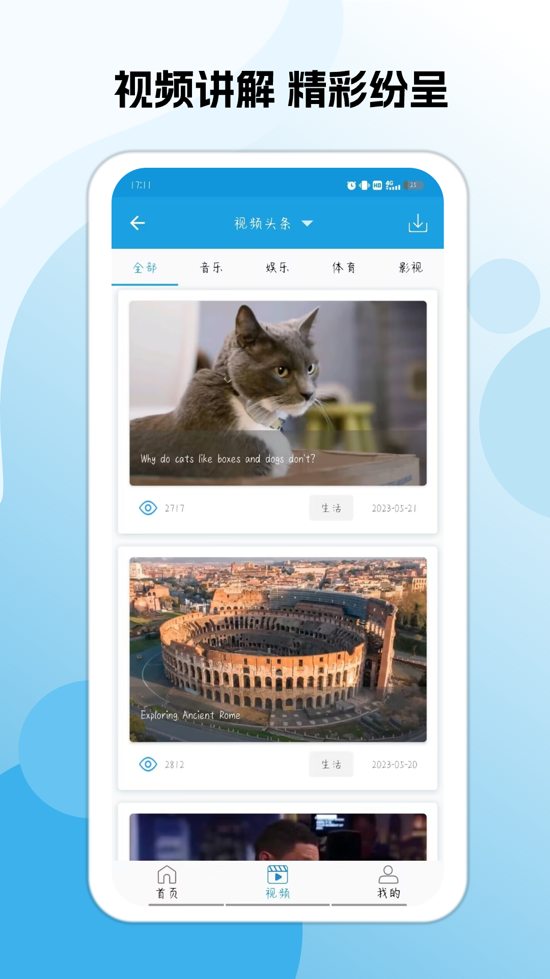 2.海量视频,每日更新:扩充了视频资源库,新增了多个主题分类。优化了视频播放器的功能,新增了倍速播放和循环播放选项,满足不同学习需求。