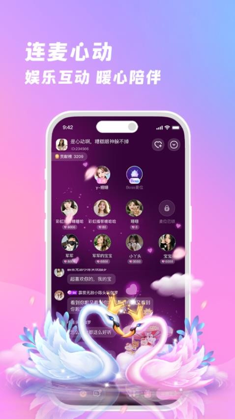 5、展开多人语音连麦互动,轻松交到很多新朋友。语音房间支持文字聊天、礼物赠送等互动方式,活跃用户会获得额外曝光奖励。遇到聊得来的朋友可以一键关注,建立长期联系。