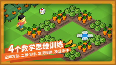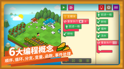 ●186个趣味关卡:包含种植、收割、植保、采摘、伐木等多种农场活动,还有可爱的小动物互动环节,让孩子乐在其中。●6大编程概念:系统教授顺序执行、循环结构、条件分支、变量使用、函数调用和事件处理等核心编程思想。●4项数学思维训练:通过空间方位判断、二维坐标定位、规律发现和条件满足等游戏环节培养数学能力。●6张农作物卡片:详细展示小麦、玉米、大豆、胡萝卜、南瓜、卷心菜等作物的生长过程。●3种智能农机:可编程控制的无人机、播种机和收割机,让孩子体验现代农业科技。●语言支持:提供简体和繁体中文界面,并包含数十个与农场相关的英文单词学习。