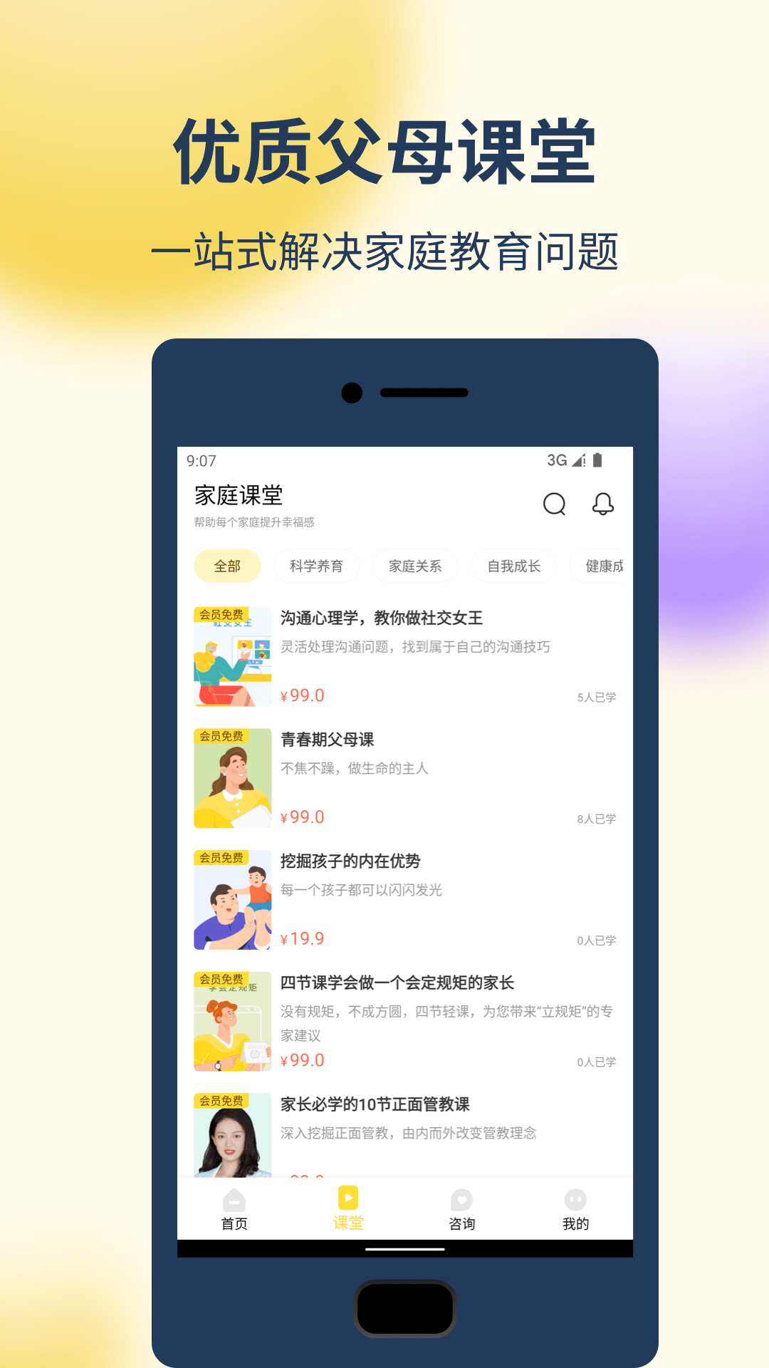 1.课堂:全新改版父母课堂界面,增加课程分类筛选功能,优化视频播放体验,新增课后测试与学习报告功能。