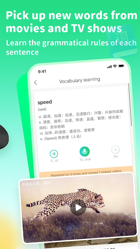 3、【记单词】遇到视频中的陌生单词可一键添加到个人生词本,系统会根据记忆曲线安排复习计划。通过视频场景联想记忆法,将单词与实际使用场景相结合,配合重复训练功能,有效加深单词印象,告别死记硬背的传统学习方式。
