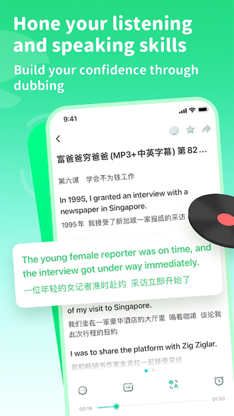 1、【学口语】通过为海量精选视频配音,模拟真实人物对话场景,帮助用户练就地道口语发音。软件支持英美式英语、日语、中文等多语种练习,满足不同语言学习需求。专业的语音识别技术可精准分析发音问题,让用户掌握最标准的语音语调。