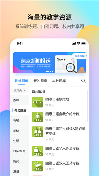 资源库持续更新扩充,不仅包含考试必备的四六级素材,还整合了日常生活、商务社交等实用场景对话,配合分阶训练课程,满足从基础到高阶不同水平学生的学习需求。