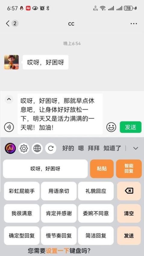 2、在聊天界面中,可随时切换至软件提供的智能键盘模式。该键盘集成了常用话术快捷入口和智能预测功能,能根据对话内容实时推荐合适的回复选项。