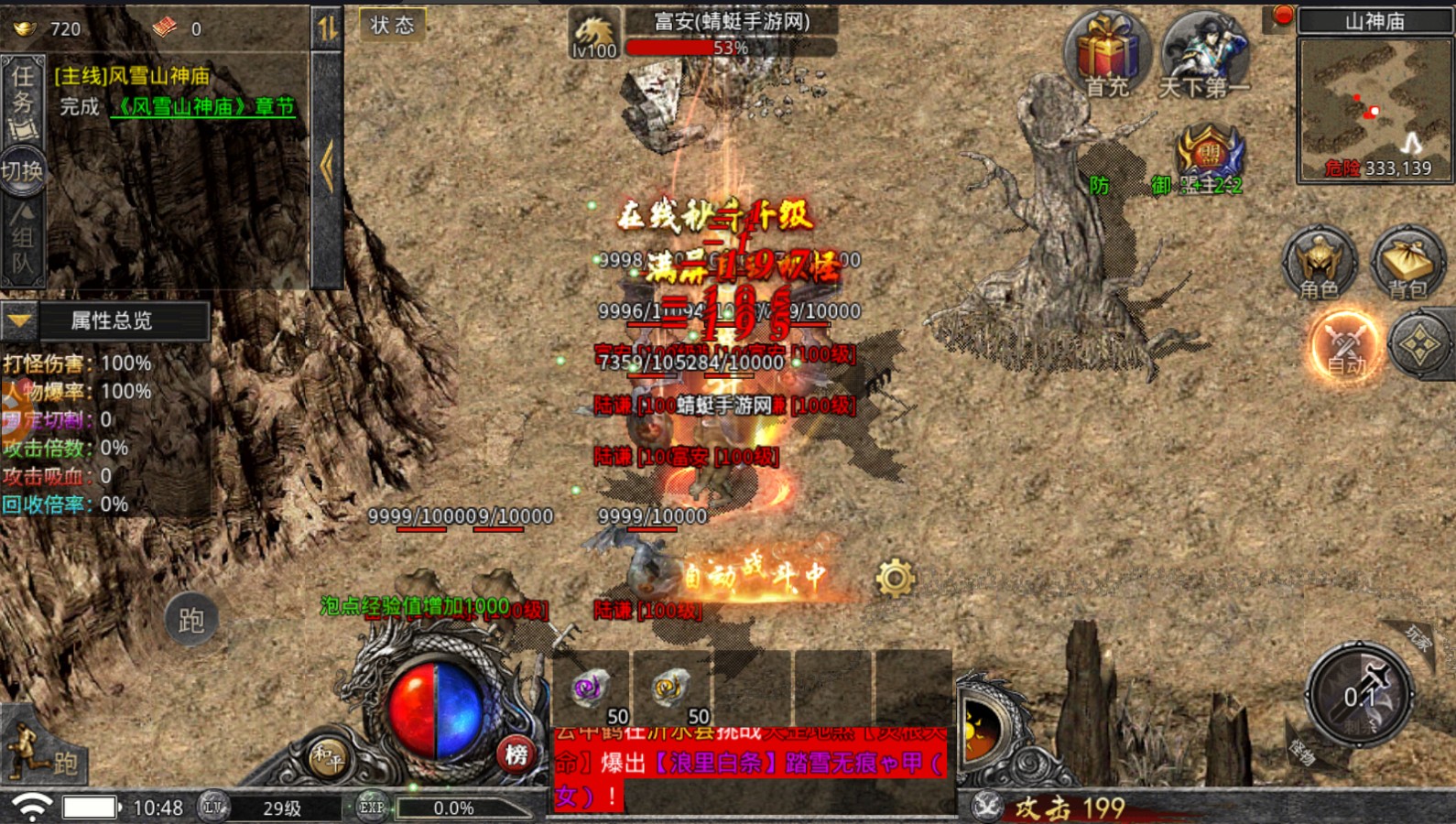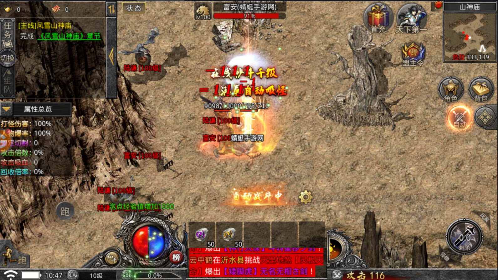游戏画面 基础设定: 游戏操作简单易上手,自动战斗系统设计得非常人性化。内挂系统功能全面,包含自动加血、自动复活、自动拾取等实用功能,让玩家可以轻松挂机升级。任务系统指引清晰,新手玩家也能快速掌握游戏要领。社交系统完善,组队、交易、行会等功能一应俱全,方便玩家结交志同道合的伙伴。