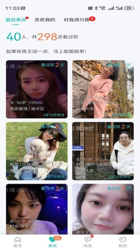 平台汇聚了大量优质单身用户,包括各行各业的精英人士、时尚达人和高颜值用户。丰富的用户群体为用户提供了更多选择机会,满足不同择偶需求。