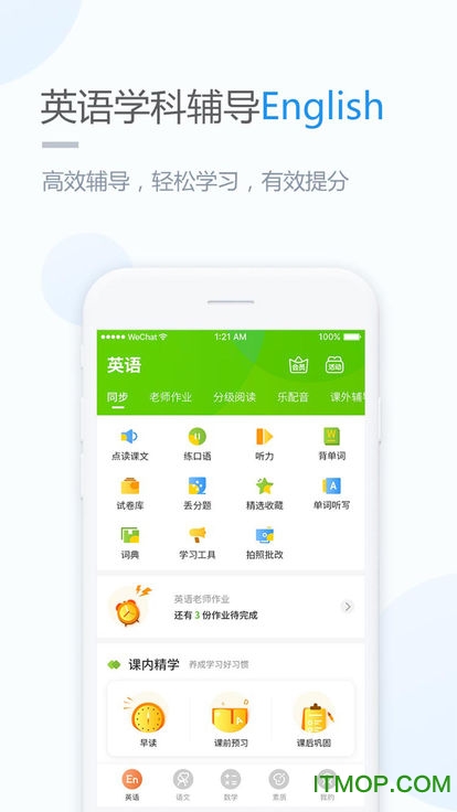 英语模块拥有19项专业功能,打造沉浸式语言环境。课本点读支持逐句跟读评分;口语训练采用智能语音识别技术;丰富的听力素材涵盖日常生活场景;语法训练通过趣味动画解析难点。平台还提供欧美外教课程、分级阅读材料和实用学习工具,从听说读写各方面提升英语能力。每日英语推送保持学习连贯性,乐配音功能让学习充满乐趣。