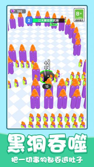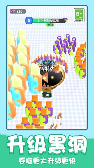 2、游戏设有完善的属性升级系统,玩家可以通过积累资源来进一步提升黑洞的各项能力和强度,从而更好地应对后期关卡中越来越复杂的挑战。升级路线多样,玩家可以根据自己的游戏风格进行选择。