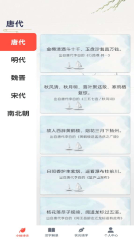 3、涵盖从唐代到元曲的各类诗歌图书馆,满足不同水平的学习需求。按朝代、题材、作者等多维度分类,支持语音朗诵和书法临摹功能。