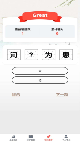 4、亲切的成语答案提示,帮助更轻松高效地完成正确任务;采用渐进式提示系统,从首字提醒到典故关键词,既保持挑战性又避免挫败感。