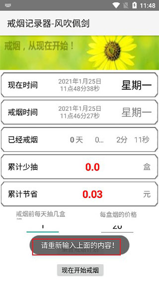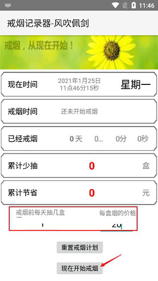 2、首先需要输入戒烟前每天的吸烟量以及香烟单价,点击"现在开始"按钮即可启动戒烟计时。系统会自动保存您的初始数据,作为后续计算的基础依据。