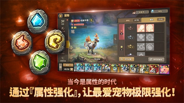 游戏中的驯兽师和宠物都拥有1-2种属性,分为"火"、"水"、"地"、"风"四大类,彼此之间存在相克关系。宠物按星级可分为2星"蓝色"、3星"紫色"、4星"红色"、5星"金色"和6星"橙色",星级越高基础属性越强。目前游戏中共有超过250种宠物,根据功能可分为5大类型: