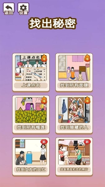 找出秘密游戏是一款融合多种益智玩法的创新游戏,为玩家带来丰富多样的挑战体验。游戏包含寻物、快速点名等趣味板块,不仅考验玩家的观察力和反应速度,更要求玩家保持高度专注才能顺利通关。通过精心设计的关卡任务,玩家将在紧张刺激的游戏过程中不断提升自己的认知能力,享受解密带来的成就感。