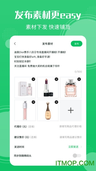 3、增加素材群发功能:支持将同一组素材(包括图片和文案)批量发送给多个客户或群组,大幅提升营销效率。