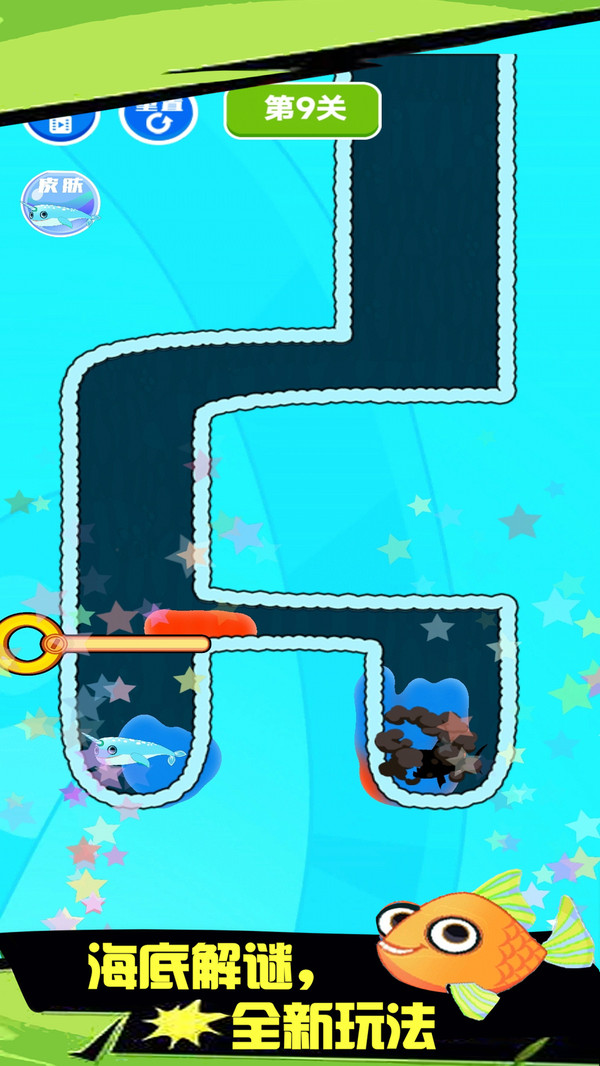 这款游戏以清新明快的画风呈现了一个危机四伏的水下世界。玩家将扮演小鱼守护者,通过经典的拉针玩法解决复杂的水流导向问题。被困的小鱼面临多重威胁:有毒气弥漫的区域会逐渐消耗生命值,干涸的沙地会加速脱水,而突然滚落的岩浆块更会带来致命伤害。游戏巧妙融合了物理引擎与逻辑推理,玩家需要预判拔出别针后引发的连锁反应,在解救小鱼的同时还要避开移动的螃蟹、喷墨的章鱼等动态障碍,每个关卡都像精心设计的微型生态系统。